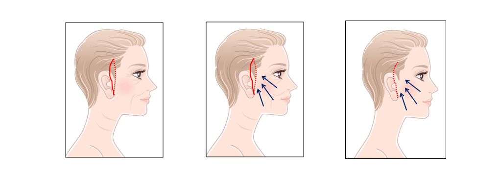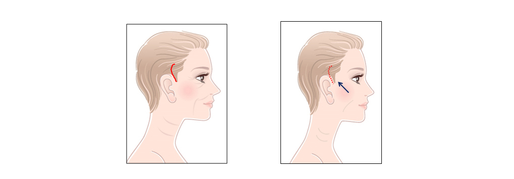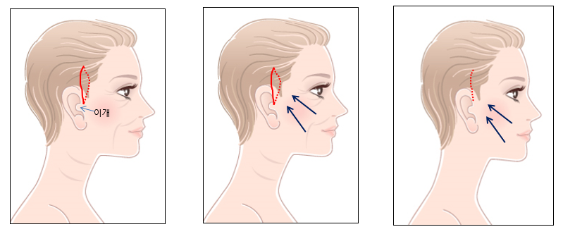 •귀위 머리속 최소절개로 내부에서 스매스층과 늘어진 피부를 절제하고 피부를 잡아당겨 심부건막에 걸어주어 리프팅하는 최소침습수술로서 흉터가 거의 안보이므로 흉터 노출을 우려 하신분들이 선호하는수술입니다